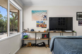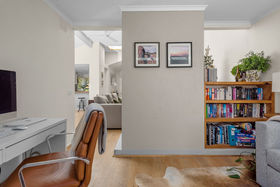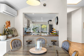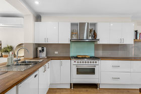 Step inside and discover a stylish chef's kitchen featuring Ilve 900mm upright stove with gas cooktop and electric oven, Asko dishwasher, gloss two-pac cabinetry, and timber benchtop. The open-plan design flows effortlessly through the living areas, enhanced by light oak engineered timber floors and a skylight that fills the home with natural light.